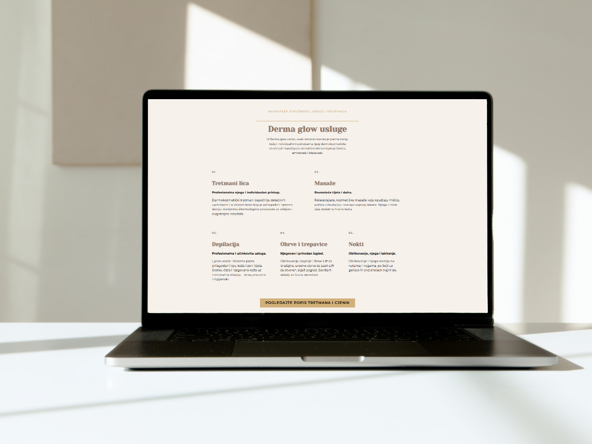 Web stranica danas služi kao centralno mjesto informiranja o tretmanima i prvi korak komunikacije s novim klijenticama, s jasnim i brzim prijelazom s pregleda usluga na izravan kontakt putem WhatsAppa.